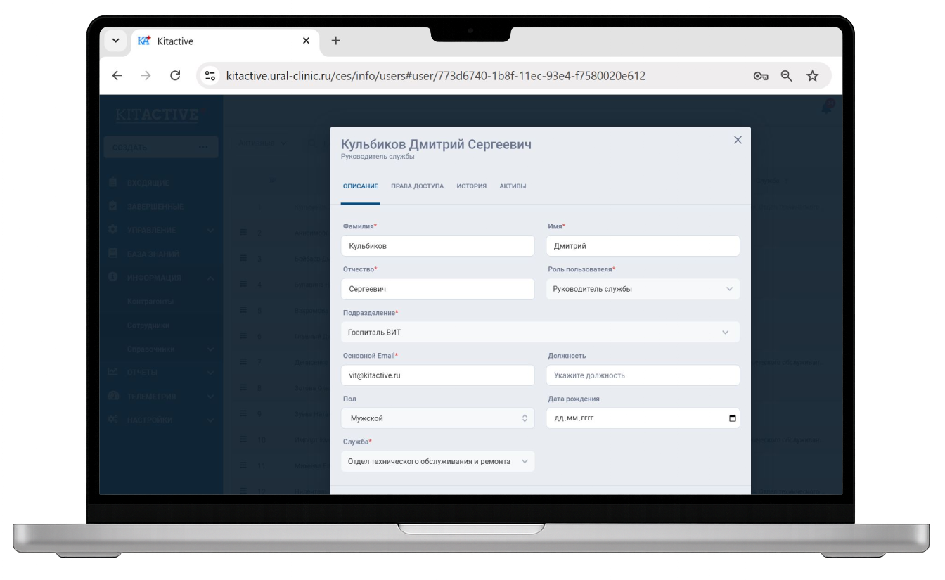 Карточка сотрудника предназначена для хранения информации по личному профилю сотрудника: должность, контактная информация и оборудование, за которое данный сотрудник несет ответственность. Через личный кабинет работник персонализирует настройки оповещения о новых задачах.